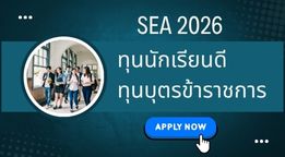 ทุนนักเรียนดี SEA 2026 SEA ยินดีมอบทุนส่วนลดจานวน 20,000 บาทให้กับนักเรียนที่มีผลการเรียนค่าเฉลี่ยสะสมในแต่ละปีการศึกษา(Grade Point Average) เกินกว่า 3.30 ขึ้นไป นักเรียนที่จะมีสิทธิได้รับทุนดังกล่าวนี้จะต้องแสดงใบแสดงผลการเรียนในระดับมัธยมศึกษาที่ออกโดยโรงเรียนที่อยู่ภายใต้การดูแลของกระทรวงศึกษาธิการ เพื่อการพิจารณา โดยนักเรียนต้องเข้าร่วมโครงการร่วมกับ SEA ภายในระยะเวลากาหนด (28 กุมภาพันธ์ 2569) โดยทุนจานวนดังกล่าวนี้จะนาไปหักลบกับค่าโครงการในการชาระเงินในงวดสุดท้าย ทุนบุตรข้าราชการ SEA 2026 SEA ยินดีมอบทุนส่วนลดจานวน 20,000 บาทให้กับนักเรียนที่มีบิดาหรือมารดา ที่กาลังรับราชการและปฏิบัติหน้าที่ในส่วนราชการไทย ยกเว้นเจ้าหน้าที่ที่ปฏิบัติหน้าที่ในหน่วยงานรัฐวิสาหกิจ นักเรียนที่เป็นบุตรข้าราชการต้องเข้าร่วมโครงการร่วมกับ SEA ภายในระยะเวลากาหนด (28 ก.พ. 2569) โดยทุนจานวนดังกล่าวนี้จะนาไปหักลบกับค่าโครงการในการชาระเงินในงวดสุดท้ายเช่นเดียวกันกับทุนนักเรียนดี